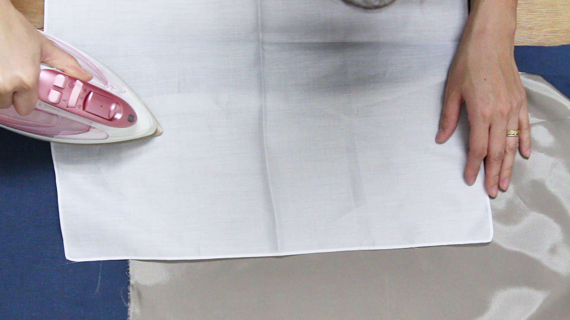 生地の上に当て布をのせ、アイロンをかけます。