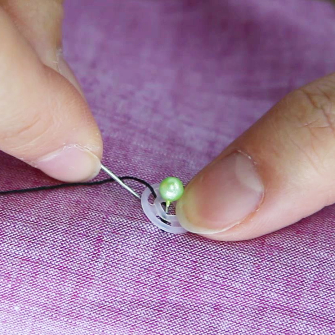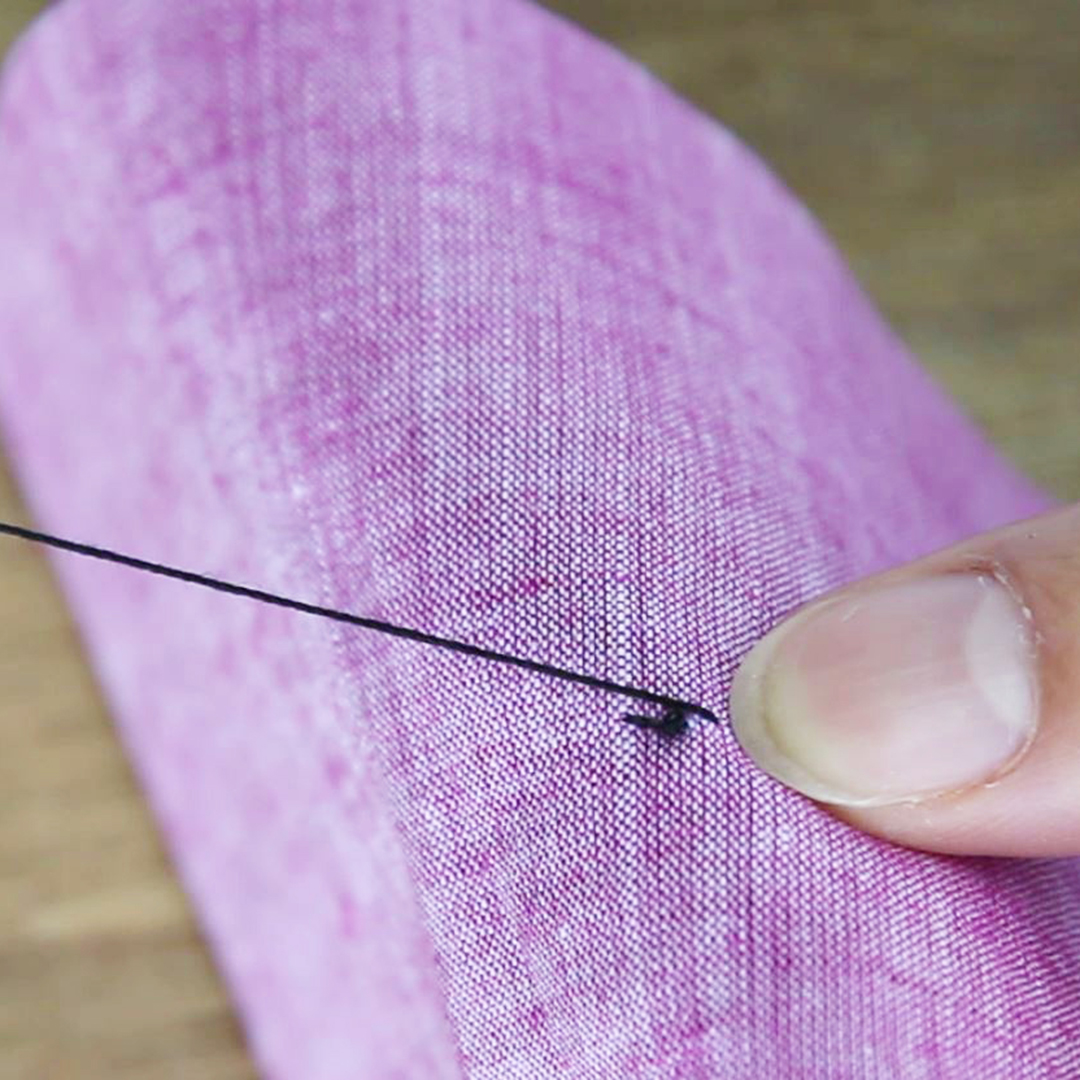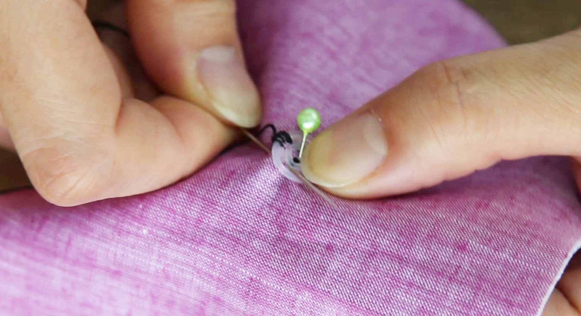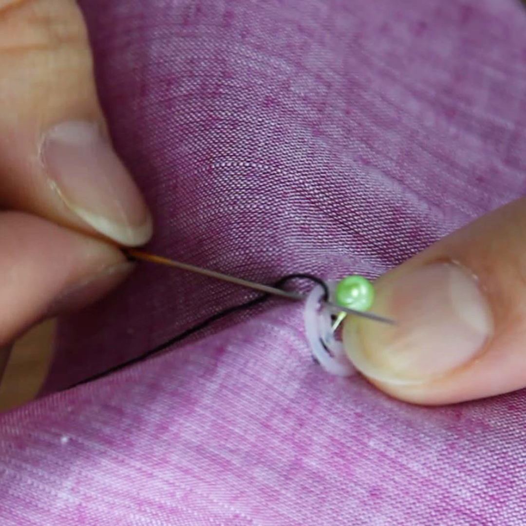 玉結びをしてスナップボタンをつける位置をすくいます。