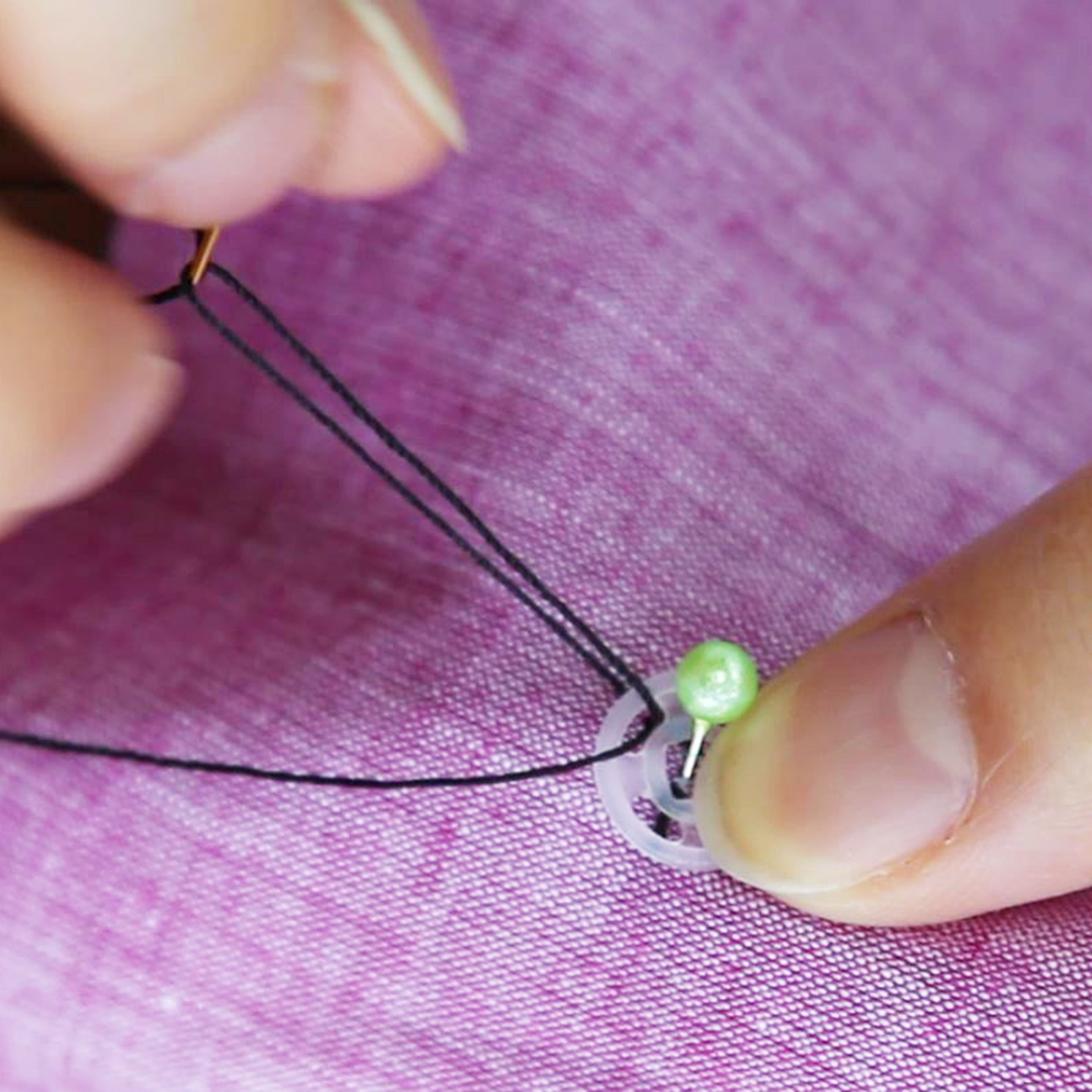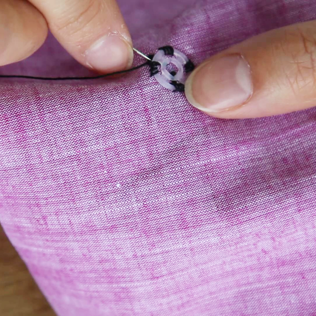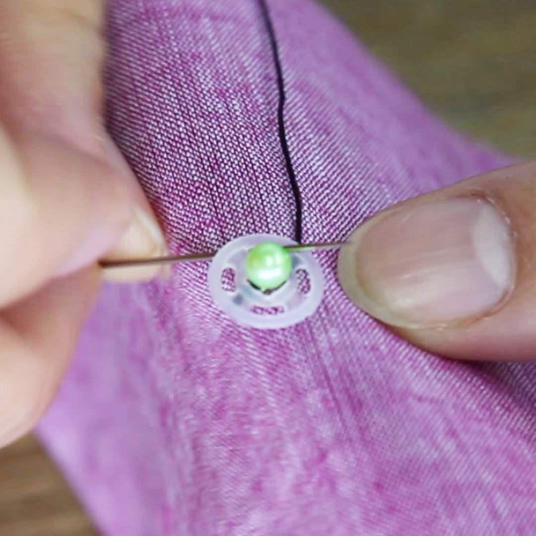 スナップボタンと生地の間に針を通し、糸を切って完成です。
